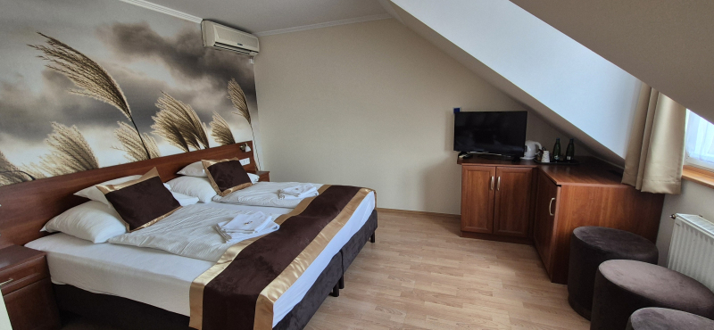 Felszereltség: Családok és kisebb társaságok számára ideális, tágas, minden igényt kielégítő szoba. A szobához mindennel felszerelt fürdőszoba tartozik. Hajszárító a recepción kérhető el. -1 db franciaágy (mérete 160x200) ...